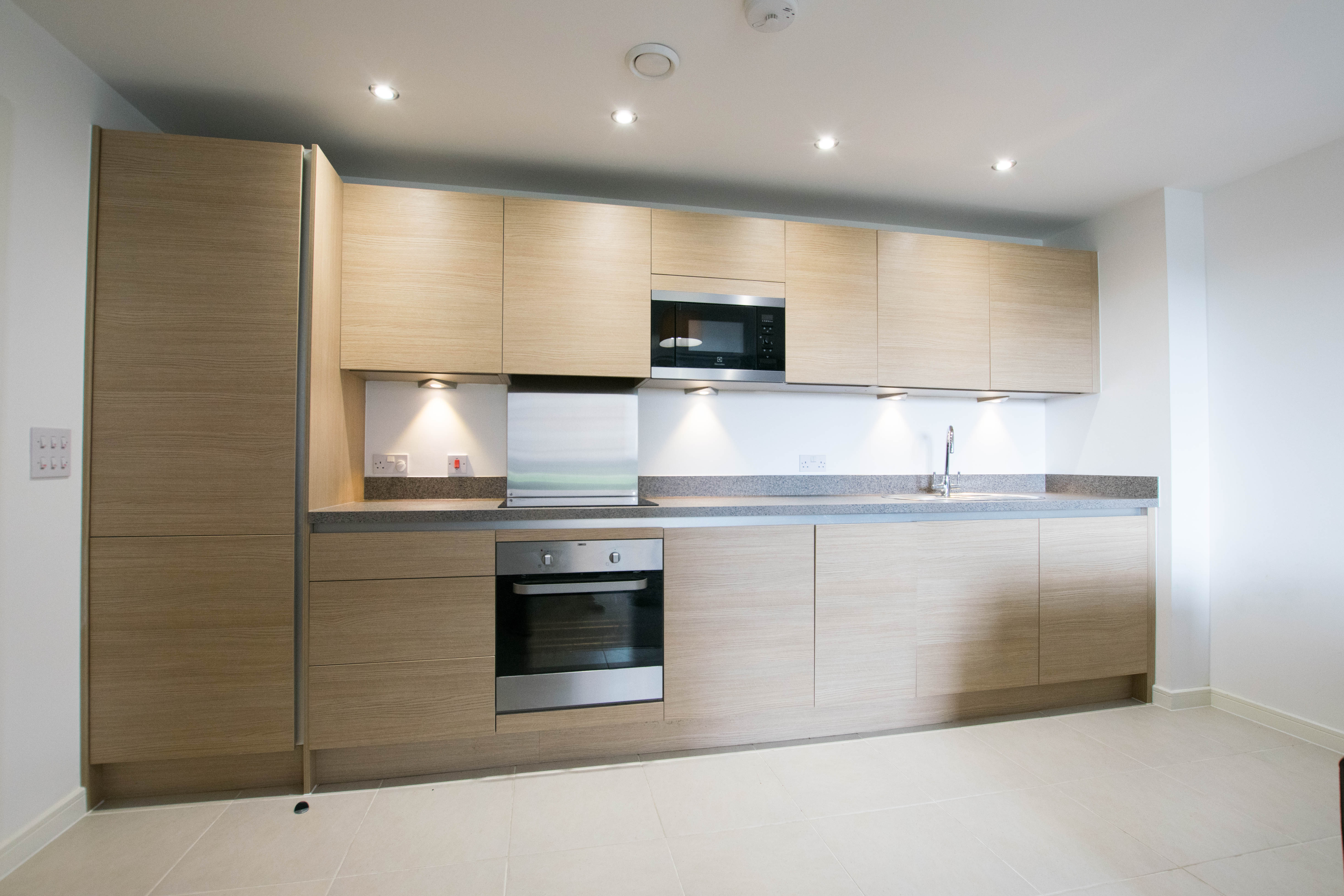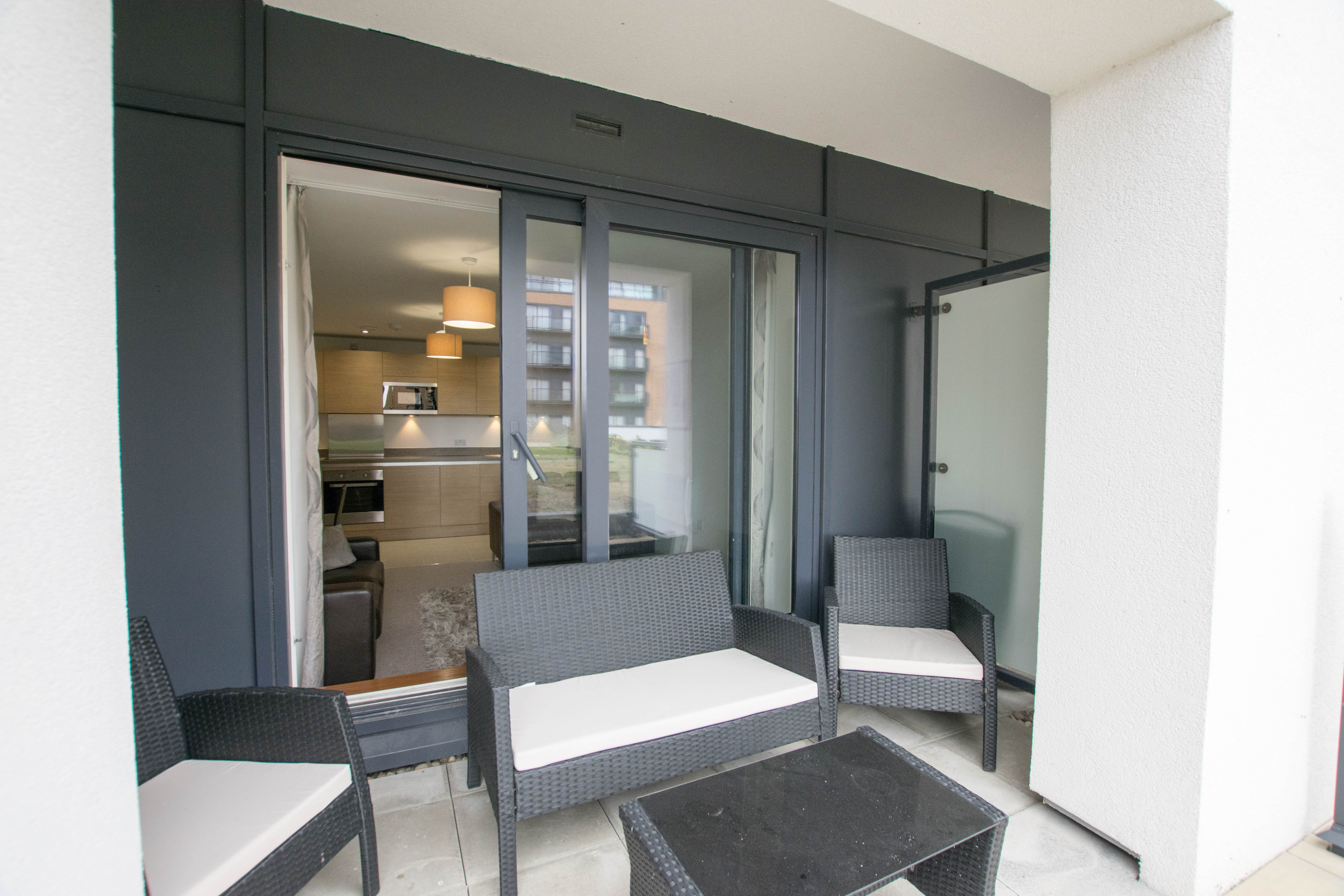 17’1 x 14’5. Patio style door to front affording water views over Cardiff Bay, range of wall and base units with inset stainless steel sink and complementing worktop over, inset ceramic hob with ducted and vented cooker hood, built under electric oven, integrated fridge/freezer, microwave, washer/dryer, dishwasher, ceramic tiled flooring in kitchen area, telephone TV aerial/sky point. Will be furnished with 2 x 2 seater sofas, glass dining table and 4 chairs, coffee table, scatter cushions, rug, lamp and curtains to windows.