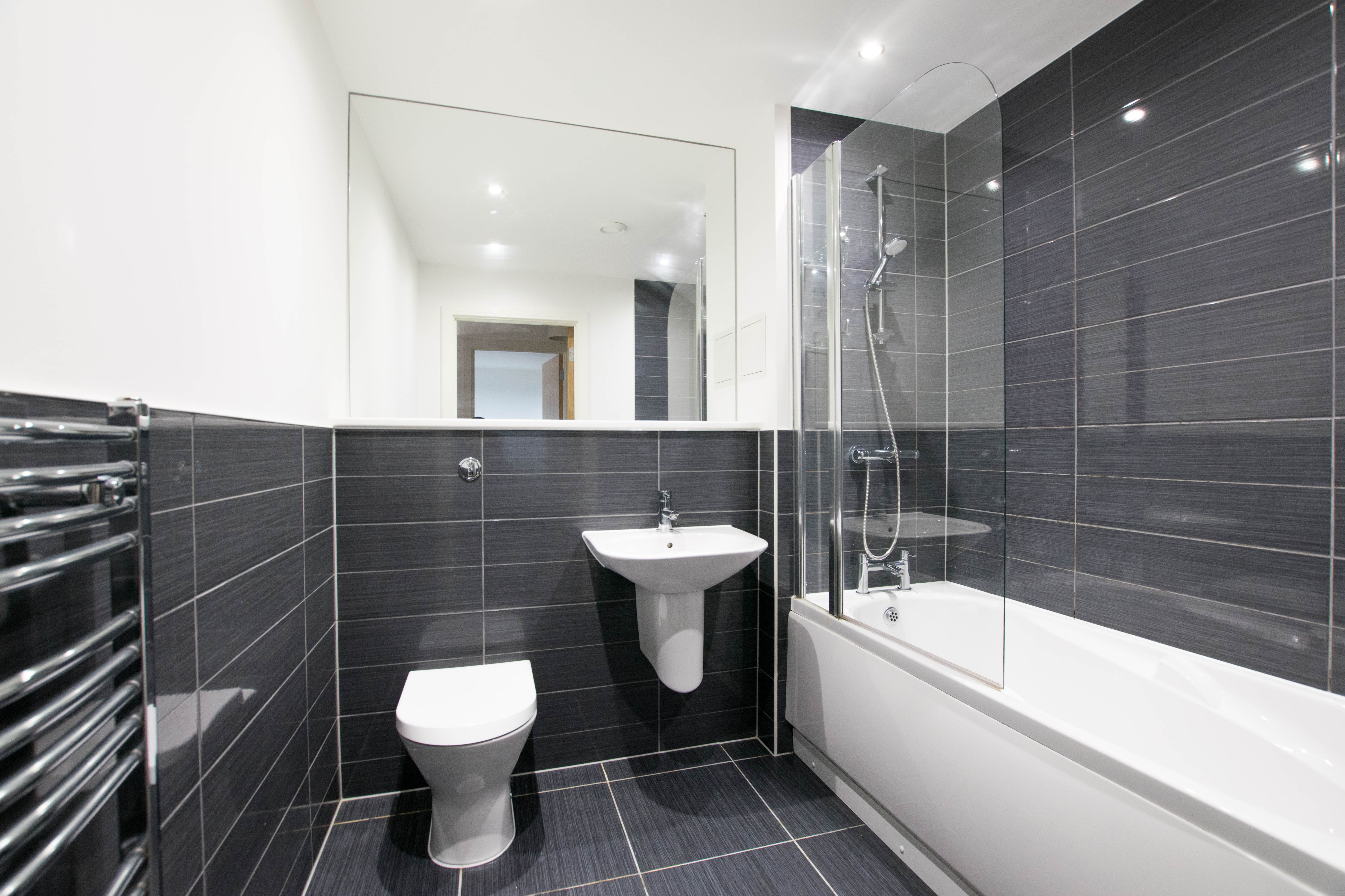 Tiled shower cubicle with thermo style mixer shower valve, vanity style wash hand basin, concealed flush W/C, ladder style electric towel rail.