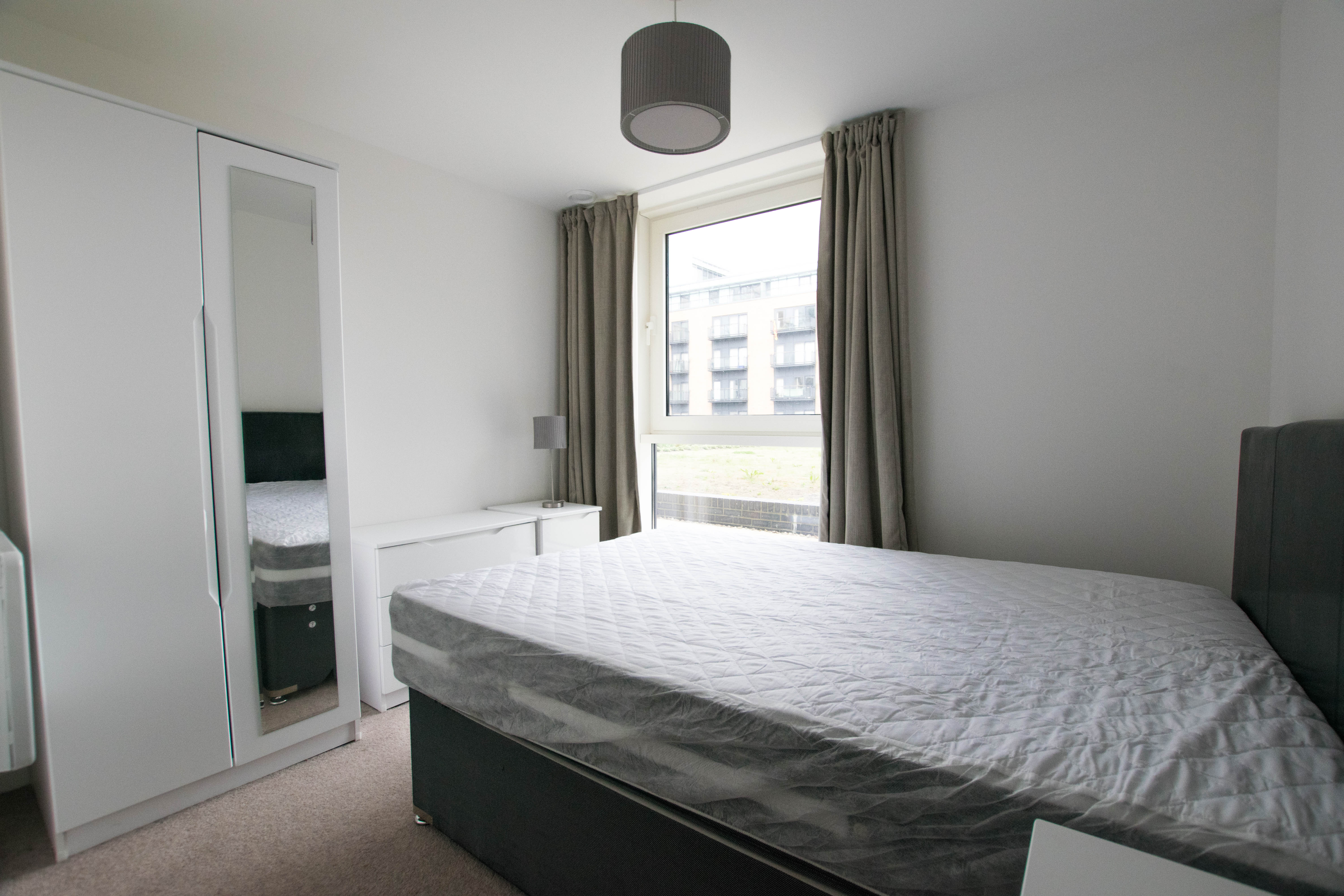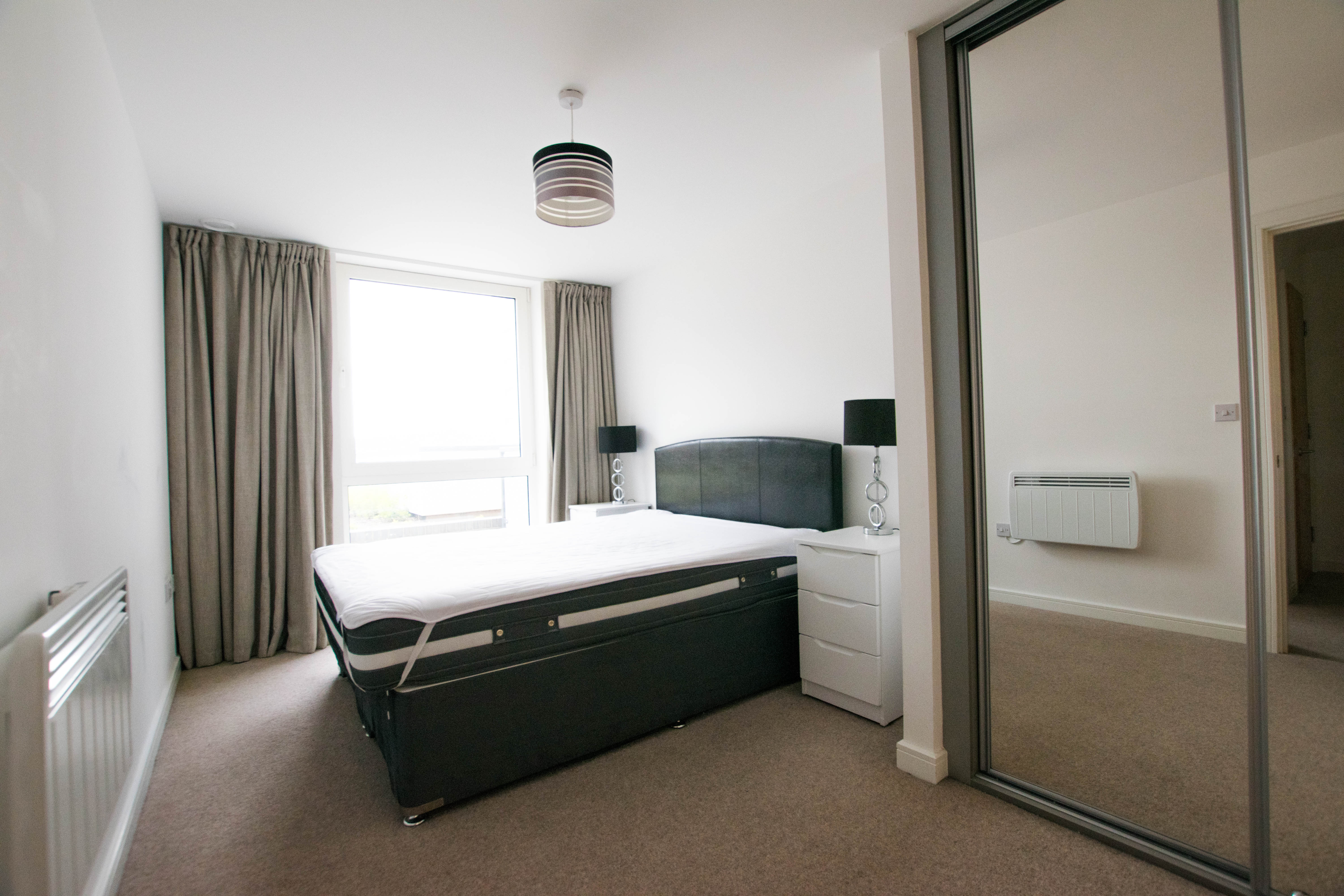 9’11 x 8’4. Window affording water views over Cardiff Bay. Double bed, bedside cabinets, mirrored wardrobe, chest of drawers, bedside lamps, curtains.